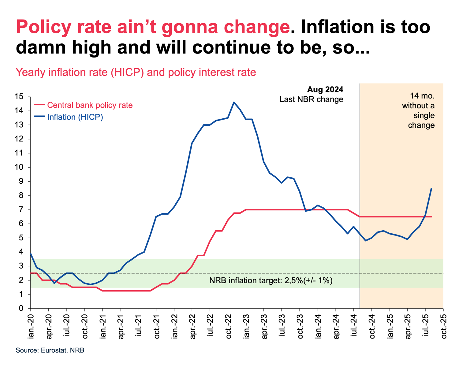 For the past 14 months the Central Bank of Romania has left the interest rate unchanged (6,50%). Sure, since the peak in late 2022, inflation has been going down and in July and August 2024, the Central Bank decided to cut by 25bp. 50bp cuts together, okay, we are down from 7,00% to 6,50%. Decent, not bad.
